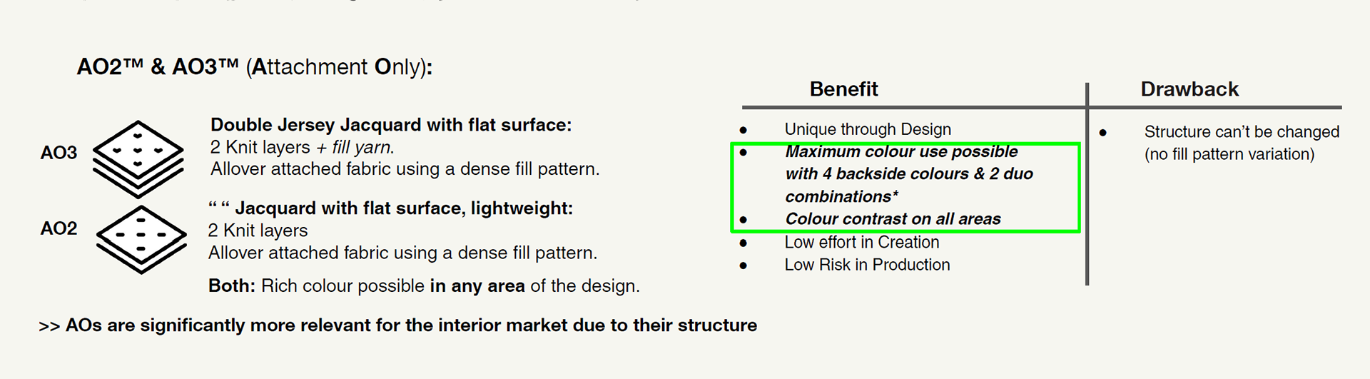 3. Shift focus on AO textiles & high-volume productions for the interior market.