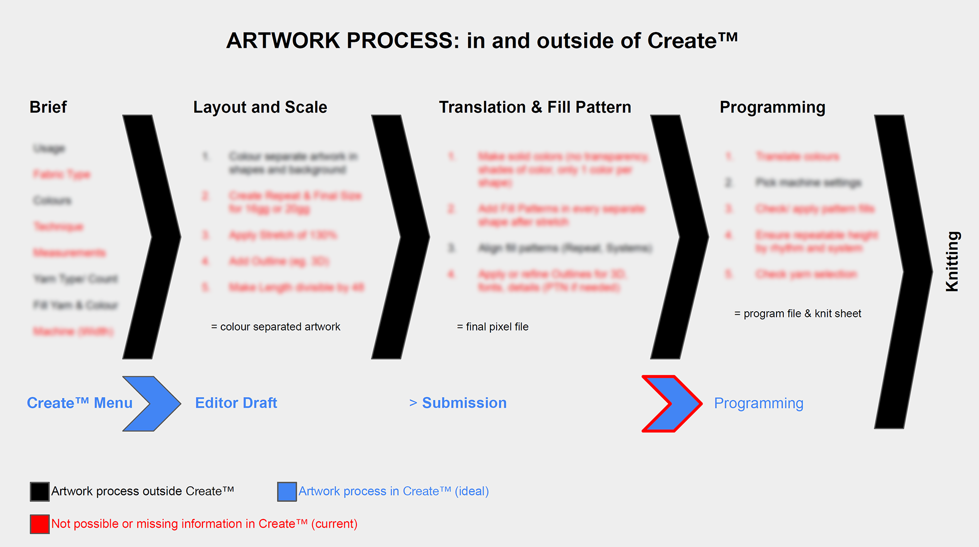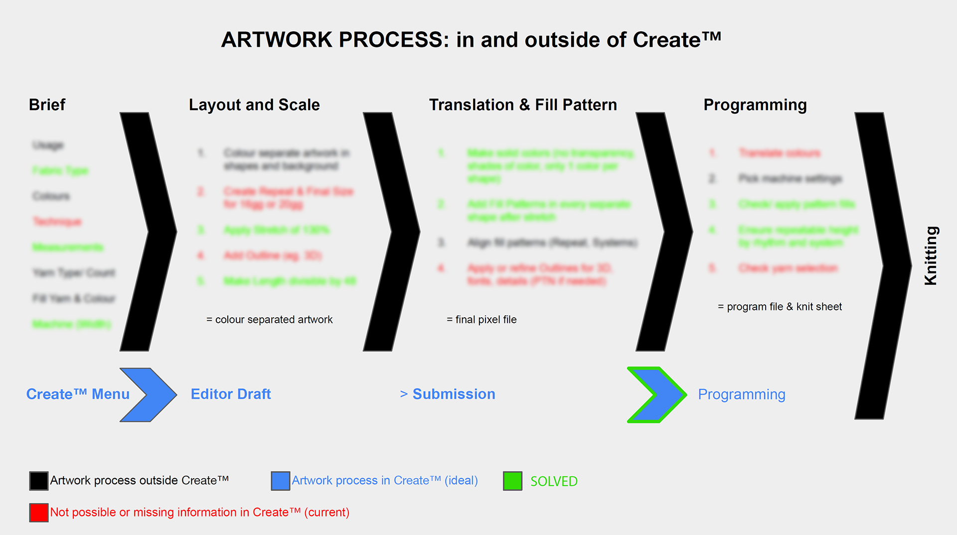 Solved steps (green) in 2022, allowing the direct file translation from pixel design to knit machine.